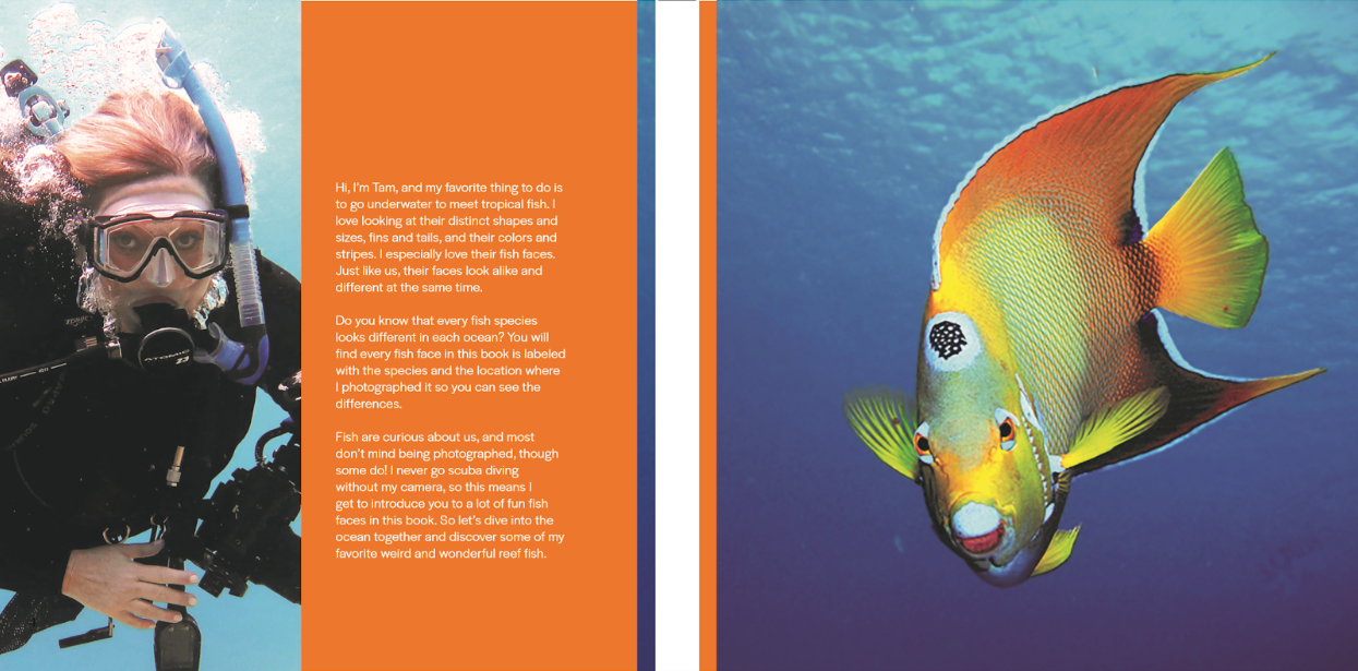 For many years I have been participating in “citizen science” which is when individuals, including kids, help scientists with research and data collection. Through citizen science, I have been able to join scientists on dive expeditions around the world and photograph various marine creatures. The result is my colorful photo book of tropical fish faces, All Fish Faces. I hope that kids of all ages will understand the importance of ocean conservation by reading and looking at the book. I have made it my mission to educate kids and engage them in the exciting and awe-inspiring underwater world. I want kids of all ages to see the color and wonder of the coral reefs. If you cannot go to the ocean, I will bring the coral reef to you!